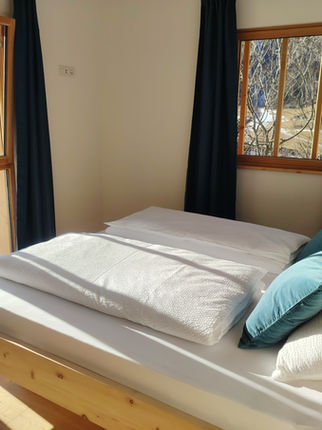 - zwei komfortable Schlafzimmer mit Panoramafenster, Doppelbett in Zirbe, Schrank, Bettwäsche; genügend Platz für ein Babybett;