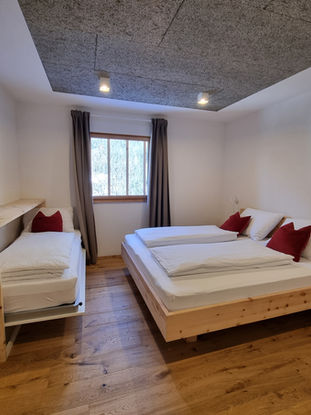 - komfortables Schlafzimmer mit Doppelbett und Einzelbett in Zirbe, Schrank, Bettwäsche; genügend Platz für ein Babybett;