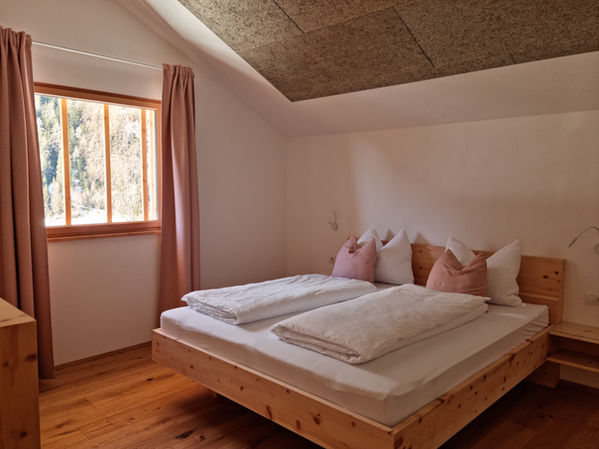 - zwei komfortable Schlafzimmer mit Panoramafenster, Doppelbett in Zirbe, Schrank, Bettwäsche; genügend Platz für ein Babybett;