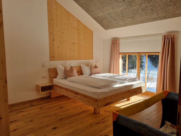 - komfortables Schlafzimmer mit Panoramafenster, Doppelbett in Zirbe, Schrank, Bettwäsche; genügend Platz für ein Babybett;